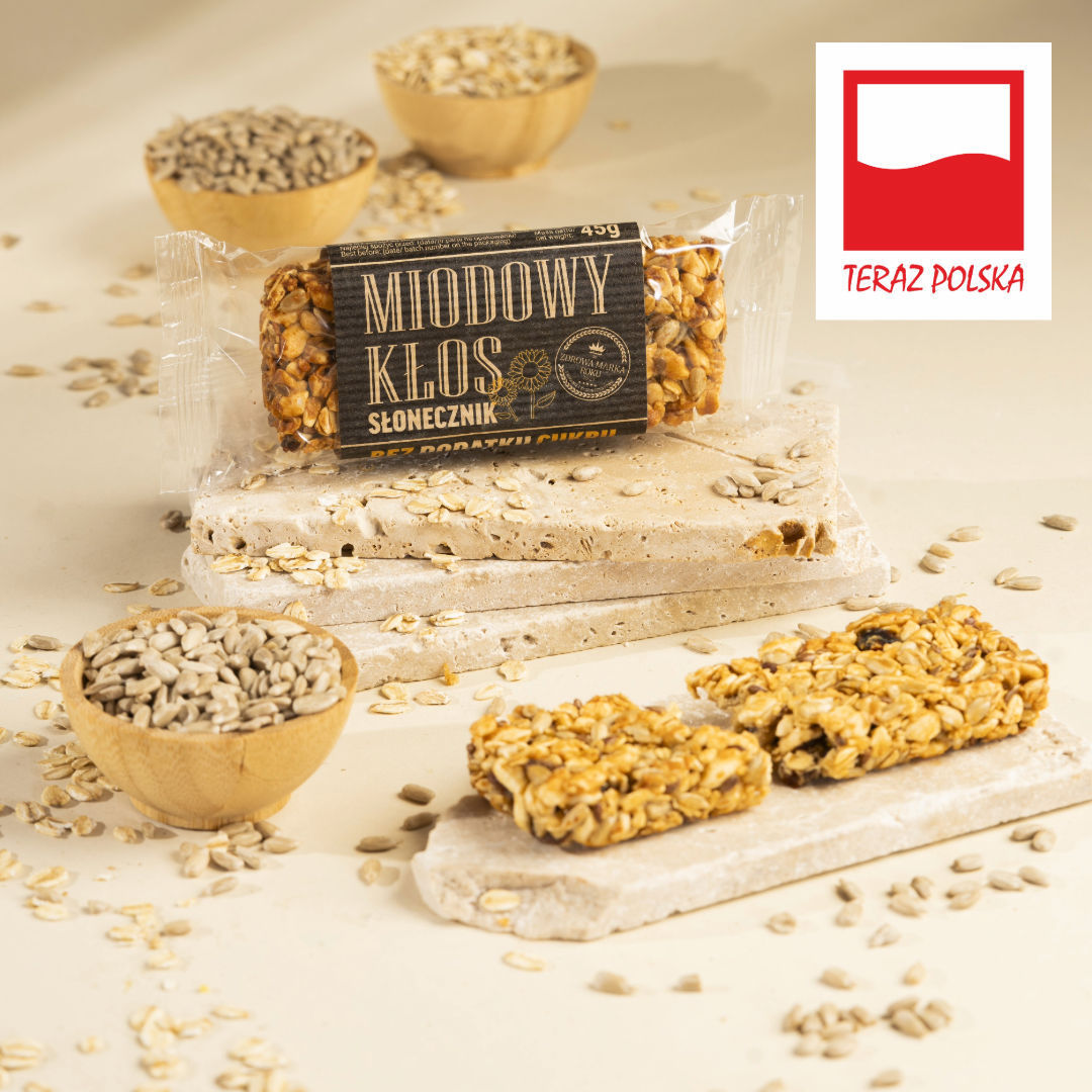 miód pszczeli (30,0%), płatki OWSIANE, ziarno słonecznika (17,1%), daktyl, ryż preparowany, MLEKO ,