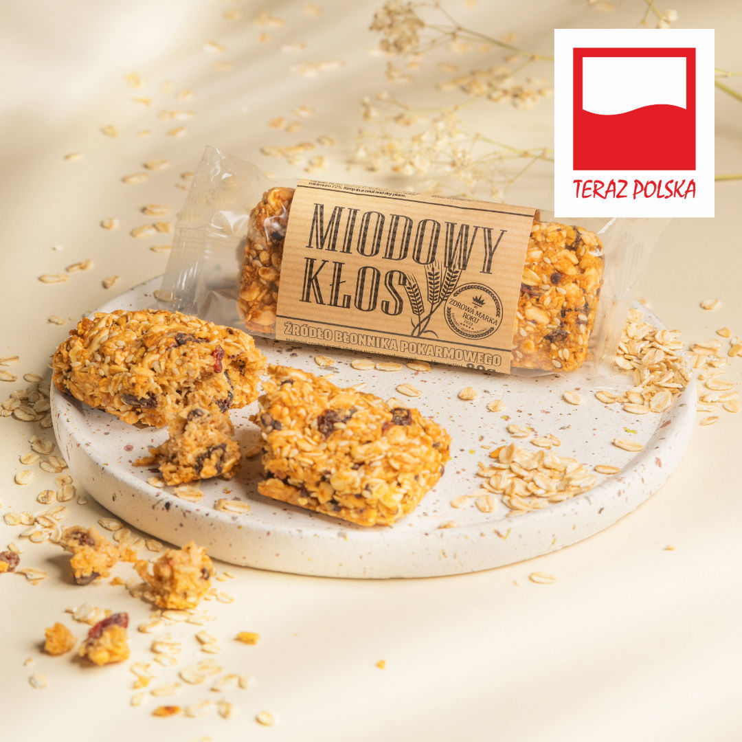 miód wielokwiatowy (20%), płatki OWSIANE (16%), MLEKO, cukier, wiórki kokosowe, rodzynki, ziarna SEZAMU, ryż preparowany, żurawina suszona, miazga kakaowa, tłuszcz kakaowy, emulgator: lecytyny [SOJA], naturalny aromat waniliowy, cynamon, imbir, olej słonecznikowy, propolis.